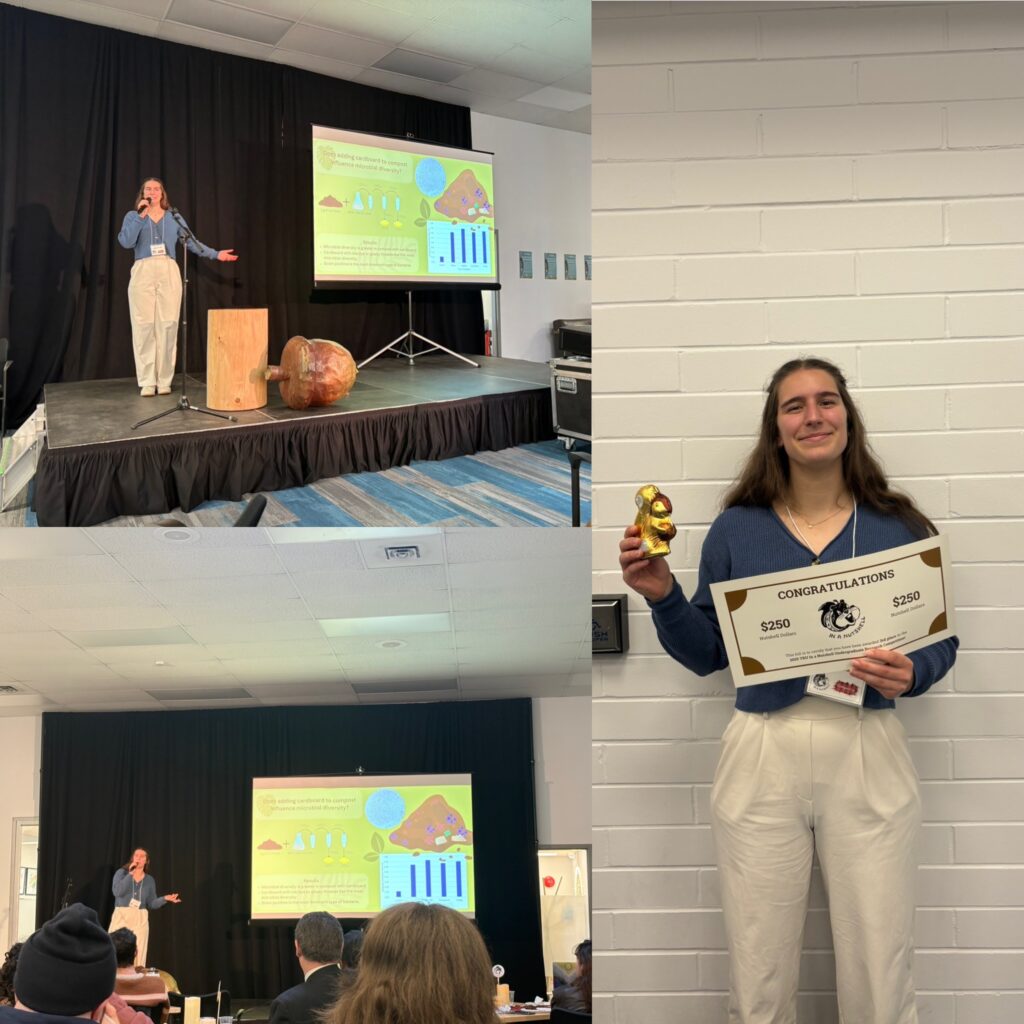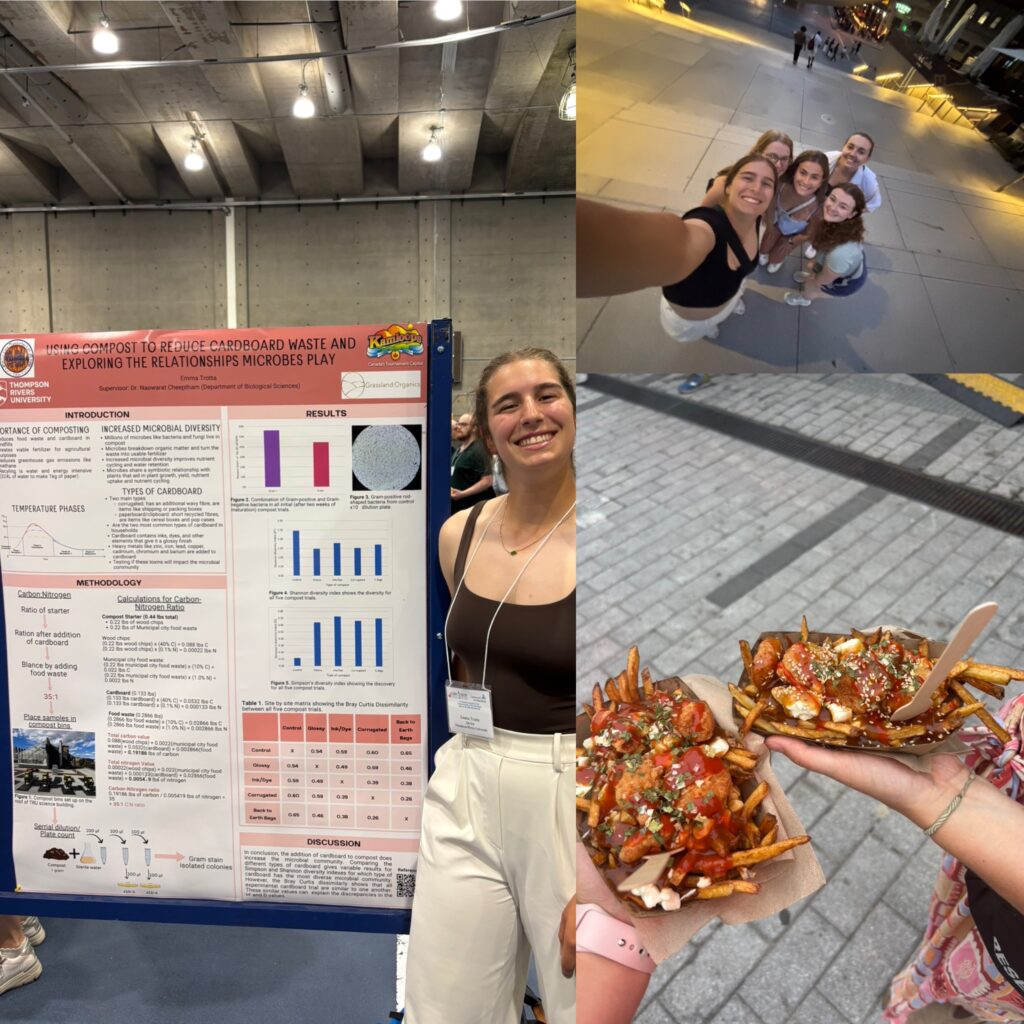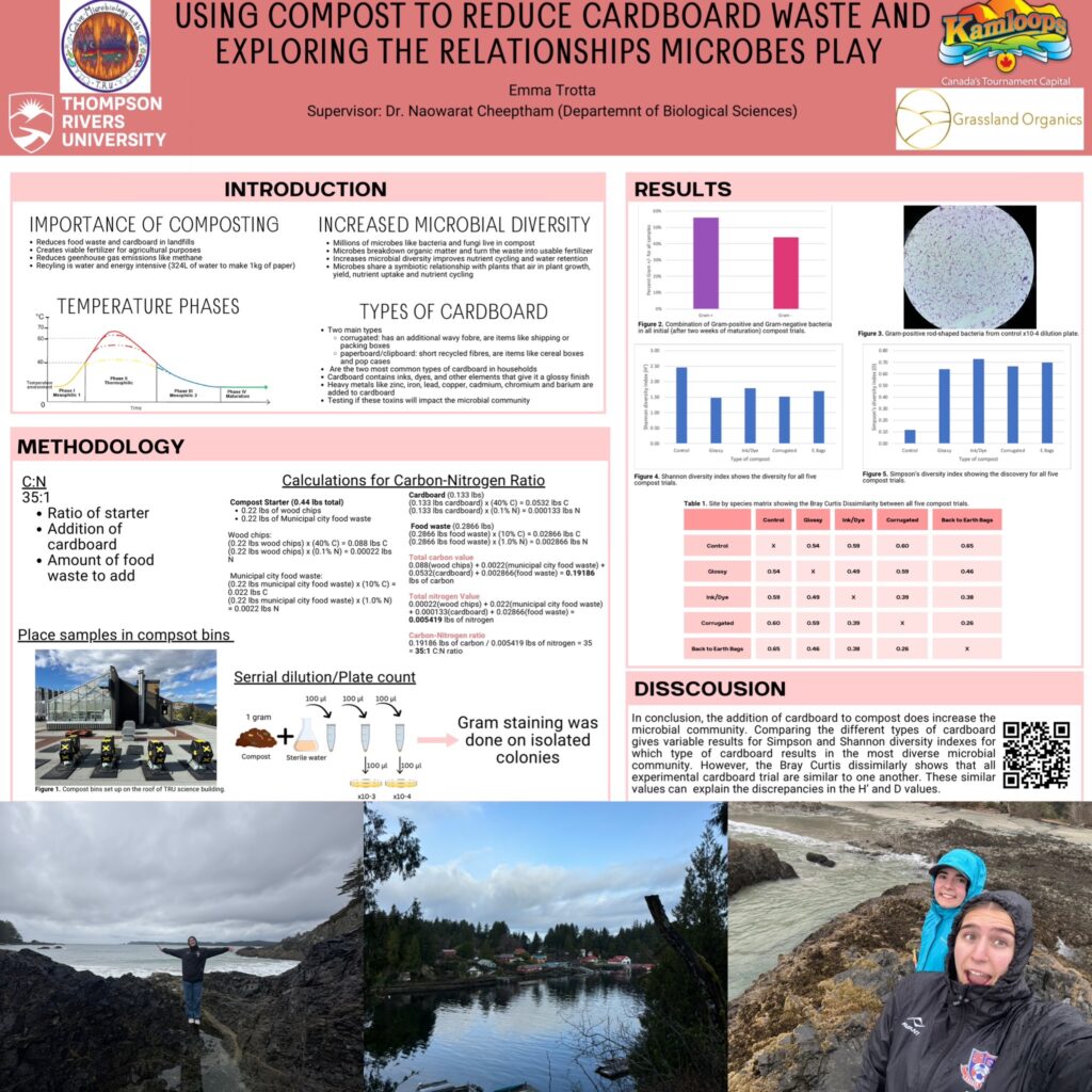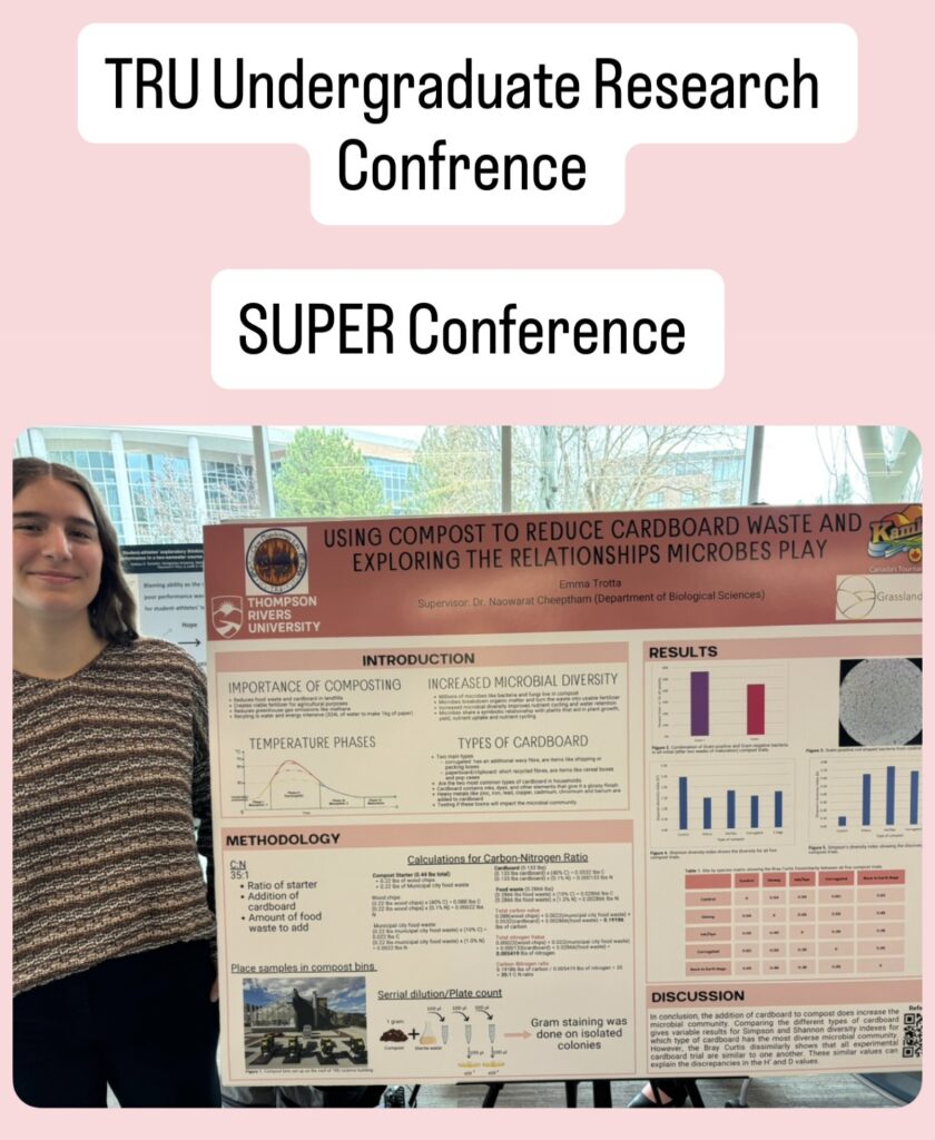 At TRU I have collaborated on various research projects. One of my favourite projects was titled “Using compost to reduce cardboard waste and exploring the relationships microbes play”. For this project myself and my supervisor partnered with the City of Kamloops in hoped to create a more sustainable way of using cardboard waste. The solution was to incorporate it in household composting bins as a carbon additive as well as a way to help with moister and smell control for households.